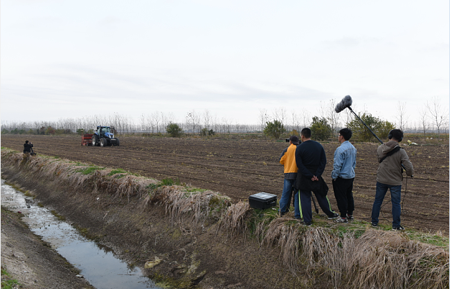 中央電視臺七套編導(dǎo)拍攝人員一行先后來到淮海農(nóng)場四五分場社區(qū)小麥播種的田間地頭進(jìn)行拍攝,攝制組人員通過大場景、近景和特寫的鏡頭,實(shí)時拍攝大型農(nóng)機(jī)作業(yè)的整體景觀和中國北斗導(dǎo)航系統(tǒng)全天候智能化播種的鏡頭,同時還就改革開放四十年來就現(xiàn)代農(nóng)業(yè)的發(fā)展變化等話題采訪了農(nóng)場有限公司的相關(guān)管理從業(yè)人員。屆時,電視新聞將在中央電視臺第七頻道《大國農(nóng)業(yè)》系列紀(jì)錄片中進(jìn)行報道。圖為中央電視臺七套農(nóng)業(yè)欄目組一行在淮海拍攝現(xiàn)代農(nóng)業(yè)時的場景。
