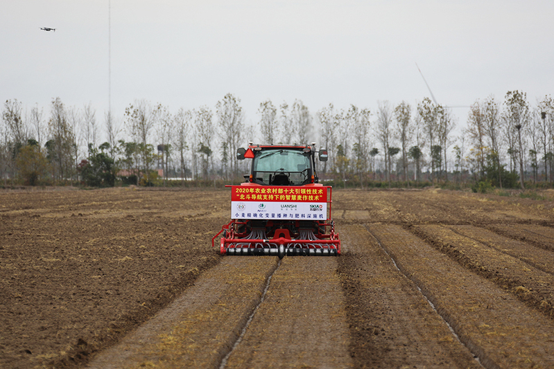 11月5日,農業農村部2020年十大引領性農業技術“北斗導航支持下的智慧麥作技術”小麥無人播種施肥技術現場觀摩會在臨海舉行,智慧麥作技術集成示范基地落戶蘇墾農發智慧農業科技園。