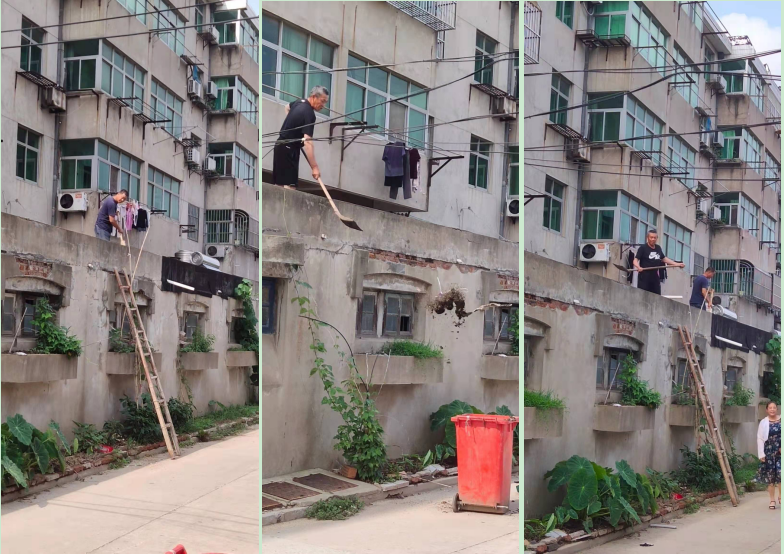 我們注意到,緊靠樓房的車庫頂上,由于風雨的影響和樓上墜落的衣物衣架,一直以來積攢在車庫頂上,長年累月就形成了一層看上去很不雅觀的垃圾,加上清掃不便,所以這里就成了影響視覺環境的一個遺忘的角落。居住在樓上的居民,為了居住環境的更友好,于是每隔一段時間,就相約聯合開展房頂垃圾的清理行動,不僅清理了自己樓下車棚頂上的垃圾,還將整幢樓的車庫垃圾清理個遍,這樣堆了好多年頭的“頑固垃圾”不見了,重新讓樓上的居民看到了樓下的”頂美“風光。