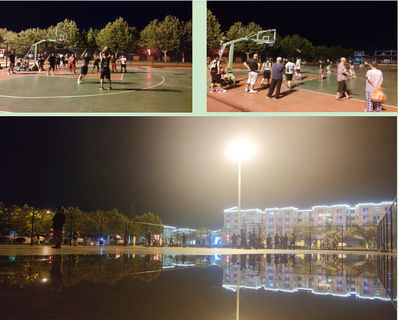 如今,天天火爆的籃球比賽成為淮海職工居民熱身運動的新常態,就連農場許多的學生甚至是孩童也拍著籃球進場投籃,籃球健身的良好氛圍,正為淮海健康體育運動注入了新的活力。圖為夜幕下的籃球運動場上職工居民追逐時的鏡頭。