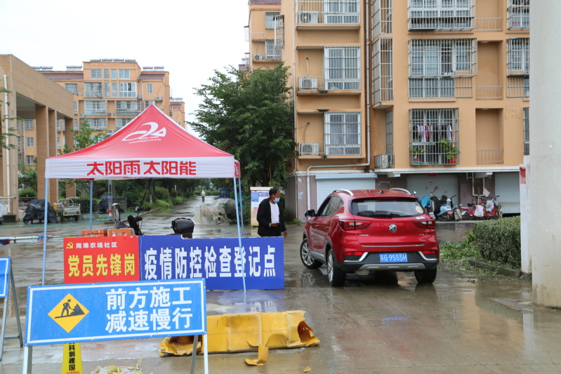 在景秀家苑小區(qū)門口,黨員先鋒崗的牌子格外顯眼,兩名黨員者愿者站的筆挺,堅(jiān)守在雨中。在振興花園小區(qū),執(zhí)勤人員對(duì)外來車輛進(jìn)行嚴(yán)格詢問登記,測(cè)量體溫。
