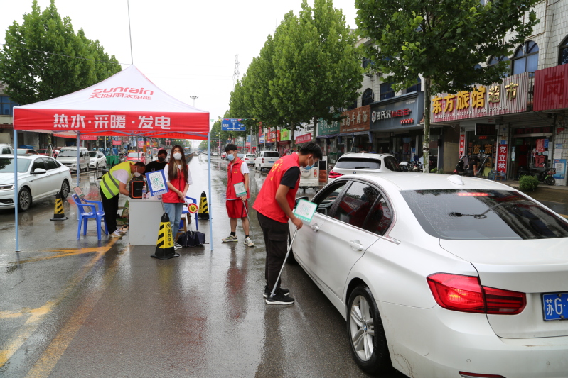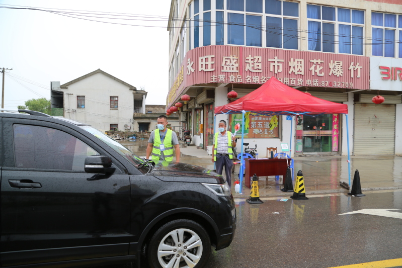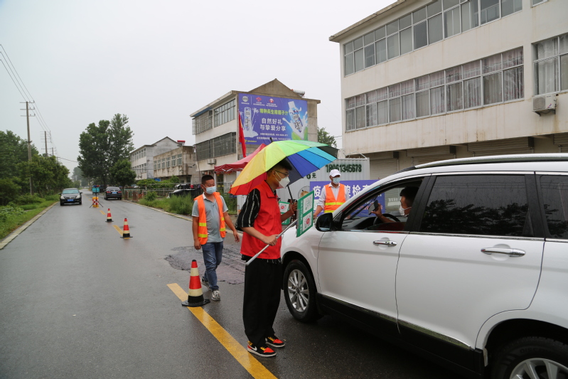 在騰飛南路卡口點(diǎn),排查人員正在對(duì)一輛外地車輛進(jìn)行排查,詳細(xì)了解其行程。該卡口是進(jìn)入鎮(zhèn)區(qū)的主要卡口,來往車輛最多,經(jīng)常會(huì)造成擁堵。但是執(zhí)勤人員并沒有因?yàn)橄掠旰蛽矶戮头潘膳挪榱Χ龋冀K在雨中耐心堅(jiān)守。
