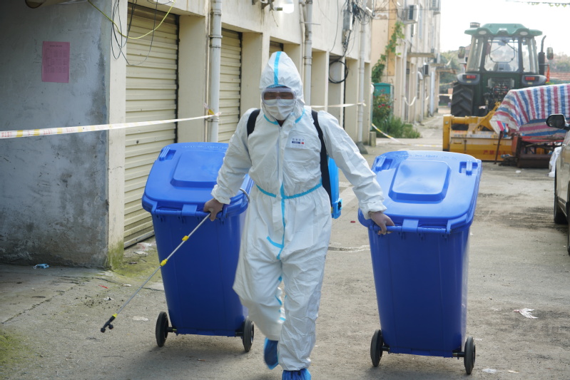 在今年疫情防控期間,三河居民新區(qū)兩幢居民樓實(shí)行封閉隔離,兩幢樓的垃圾筒無(wú)人敢進(jìn)去清理,葉微主動(dòng)請(qǐng)戰(zhàn),每天下午四點(diǎn)準(zhǔn)時(shí)對(duì)兩幢樓的生活垃圾進(jìn)行病毒消殺并清理干凈,在這期間,葉微還積極配合醫(yī)院,利用每天清理垃圾的機(jī)會(huì)對(duì)兩幢樓的樓道進(jìn)行消毒,二十斤的藥機(jī)背在身上,還要爬六層樓,整個(gè)過(guò)程大概需要一個(gè)小時(shí)左右,一個(gè)小時(shí)下來(lái),當(dāng)脫下防護(hù)服時(shí),葉微身上的汗水順著褲管往下淌,手被泡白了、臉上被勒出了一道道深深的紅印,每天重復(fù)著同樣的工作。