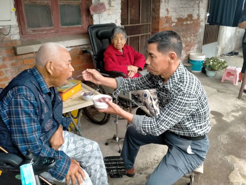 “天有不測風(fēng)云、人有禍福旦夕”,本來照顧一個癱瘓的父親,十幾年如一日就已經(jīng)足夠他忙碌的了,2015年70歲的老母親也患腦癱和心臟病,并伴有眼疾,視力幾乎失明。2019年由于眼睛視力低下,走路一不小心,又把腿摔斷了,造成生活不能自理,就這樣唐素強一個人一下子就承擔(dān)起兩位老人的照料工作,為了方便更好的照顧雙親,他就搬到父母的住處,他每天都要給父母雙親擦拭、按摩身體,洗腳、洗滌,平時老人會感到無聊,精神不振,唐素強就利用閑暇的時間陪著父母說話解悶,為了讓老人盡快康復(fù),自己從零學(xué)習(xí)康復(fù)方面的知識,挽扶老人進行康復(fù)鍛煉,經(jīng)常用輪椅推著父親或母親外出,感受新鮮空氣,看看風(fēng)景,調(diào)節(jié)父母情緒。