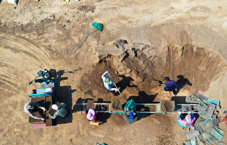 51日,寶應湖農場三分場場頭一派忙碌,擺盤、鏟土、倒稻種,7、8名工人分工合作,有序進行著落谷育秧。