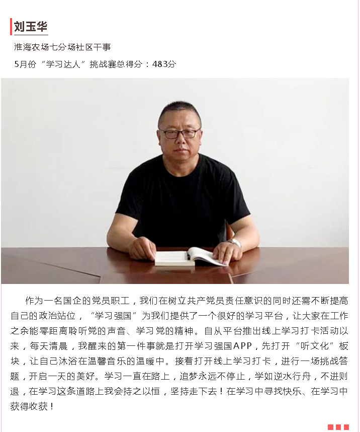 為充分展示“學習達人”風采,根據射陽縣“強國復興有我”群眾性主題宣傳教育活動安排,射陽宣傳推出“訪學習達人看家鄉變化”主題尋訪萬里行活動第一期,在全縣5月份最厲害的11名“學習達人”中,淮海的“學習達人”馮輝、陳祥、崔慧慧、劉玉華躋身其中,讓我們一起來聽聽淮海的“學習達人”們在工作中、生活上的心得感悟吧!圖為淮海學員“學習達人”們的心聲感悟。