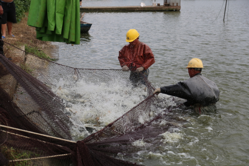 初秋的早晨已然涼意十足,早上不到6點(diǎn),天剛蒙蒙亮,捕撈人員就來(lái)到魚(yú)塘開(kāi)網(wǎng)起魚(yú)。在水產(chǎn)公司工作人員的指揮下,一張巨大的漁網(wǎng)隨著捕魚(yú)工人的移動(dòng)緩緩張開(kāi),大家不顧冰冷的水下溫度,緊張忙碌了起來(lái)。經(jīng)過(guò)鋪底、收網(wǎng)、聚攏等環(huán)節(jié)的共同協(xié)作,漁網(wǎng)被慢慢升起……整個(gè)現(xiàn)場(chǎng)一片繁忙熱鬧景象。經(jīng)過(guò)近三個(gè)小時(shí)的忙碌,在大家的精心分揀下,裝滿魚(yú)的筐子被吊車有序吊起,稱重、記錄、放魚(yú)一氣呵成。“這個(gè)吊車頂部的黃色圓塊就是電子秤,吊起魚(yú)的同時(shí),秤上的信號(hào)就發(fā)到這個(gè)無(wú)線接收裝置上來(lái),秤重既方便又精準(zhǔn)。”現(xiàn)場(chǎng)記賬的方正解釋說(shuō)。