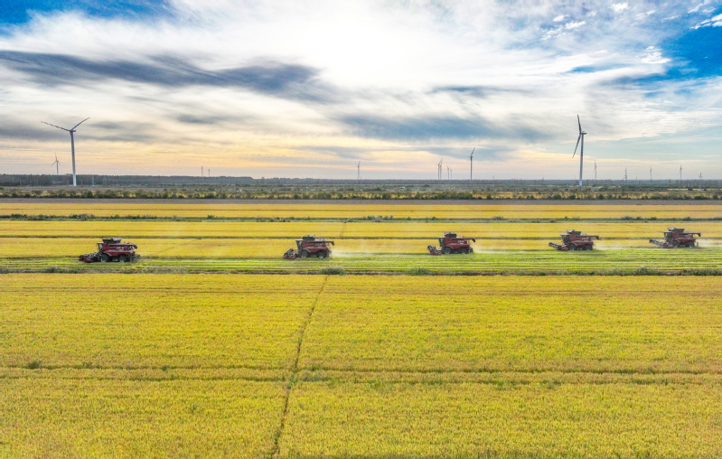 2023年10月28日,在蘇墾農發新洋分公司新南生產區19大隊的高標準農田上,五臺凱斯7088大型聯合收割機穿梭在稻田中搶收水稻。蘇墾農發新洋分公司搶抓晴好天氣,發揮農墾企業機械化優勢,確保秋糧顆粒歸倉。