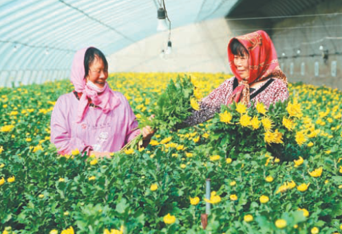 3月26日,江蘇農墾崗埠農場的溫室大棚內,采花工人正在采收菊花。隨著清明節的臨近,菊花迎來銷售旺季,據大棚經營者介紹,今天是首次采花,預計將采收3000枝左右。下一步將繼續加大管理力度,全力以赴做好市場保供工作。