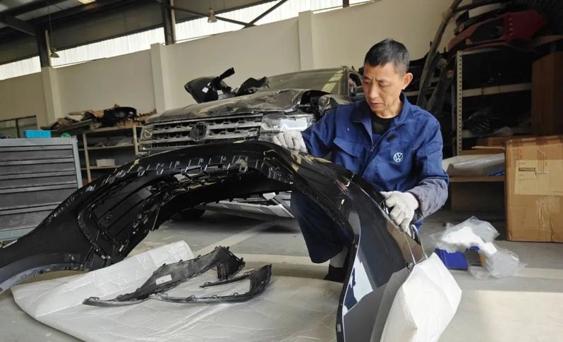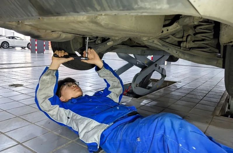 蘇舜元吉公司(上汽大眾4S店)鈑金技師胡同浩斜躺在地上,正在拆卸一輛凌渡車損壞的零件,汗水順著他的額頭流下,他的眼神專注而堅定,雙手始終沒有停歇,確保該車輛維修項目快速、有序進行。