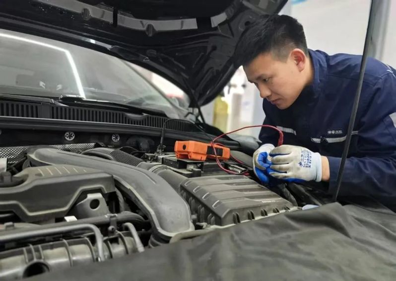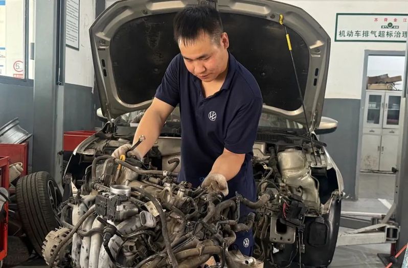 蘇舜金江公司(上汽大眾4S店)機電技師錢平崗正拆解一輛帕薩特車的發動機,他說:“客戶著急用車,這個假期就不休息了,要盡快把車修好。”