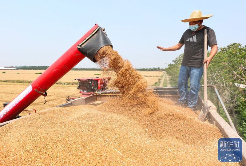 5月28日,江蘇農墾三河農場職工在裝車收割的小麥。新華社發(許昌銀攝)