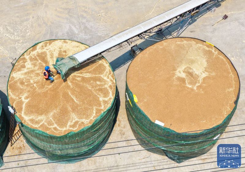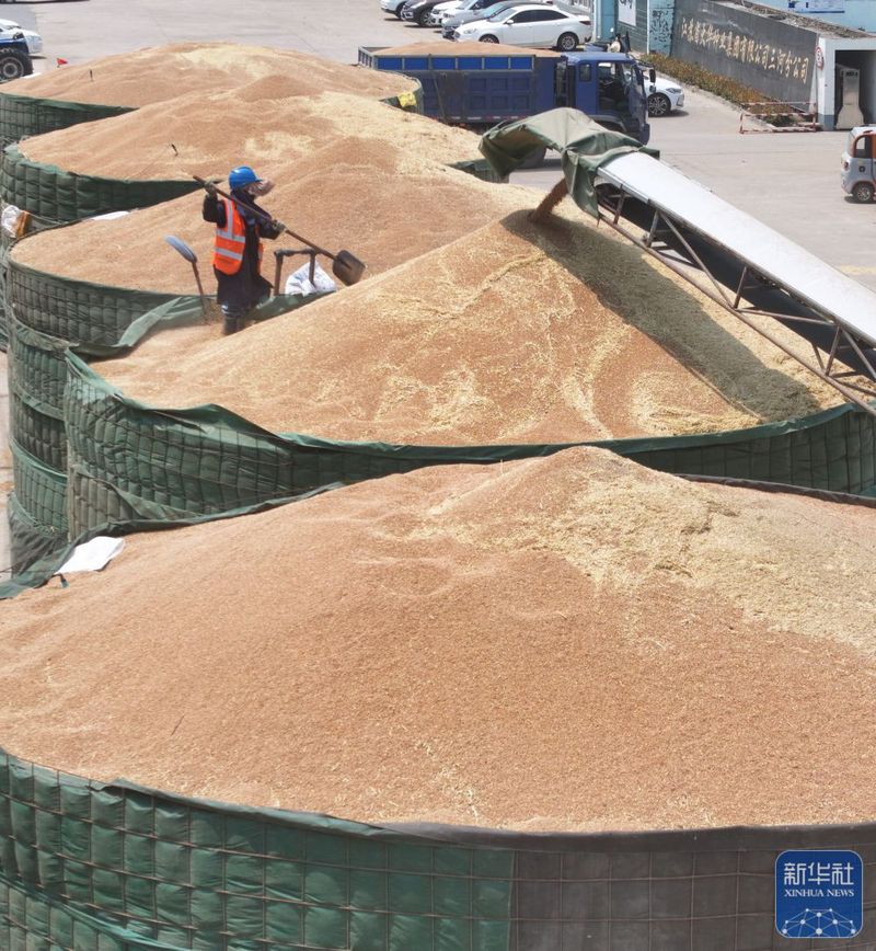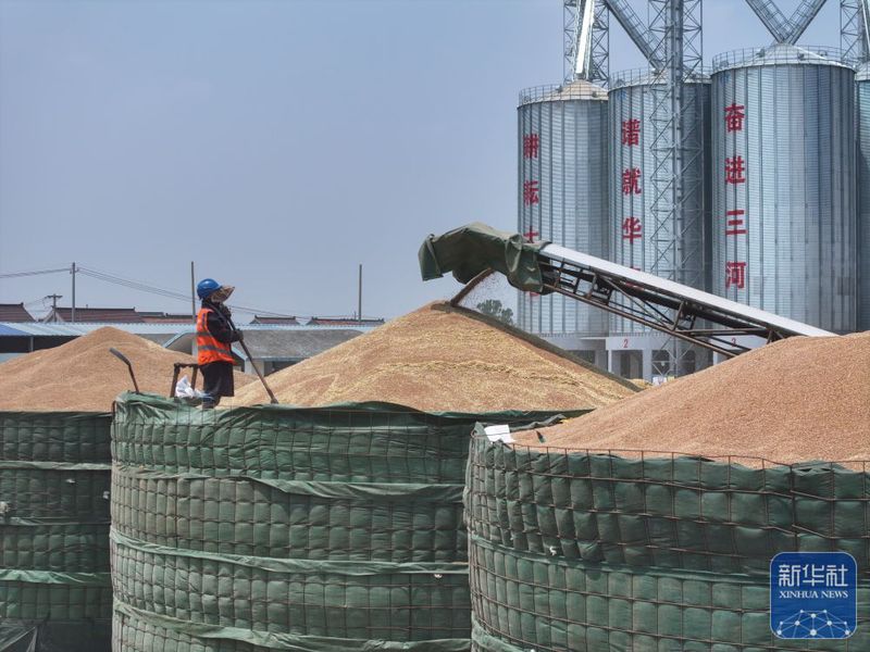 三河農場收獲的小麥進入大華種業三河分公司存儲(5月28日攝,無人機照片)。新華社記者 季春鵬 攝