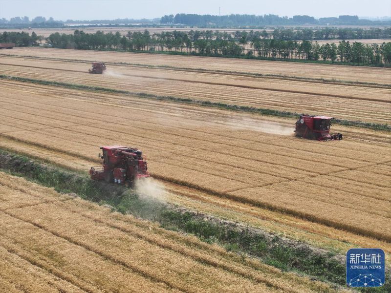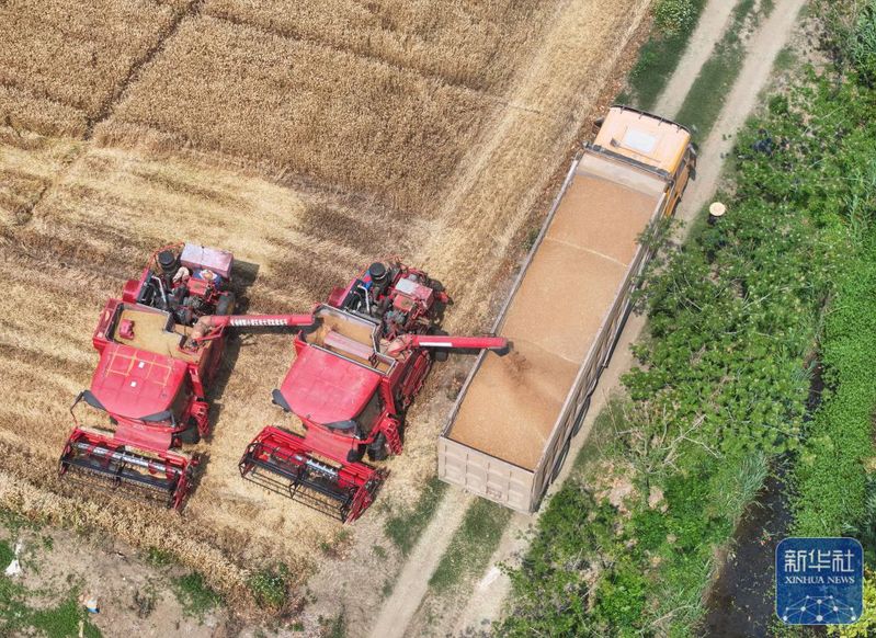 528日,收割機在三河農場收割小麥(無人機照片)。新華社記者 季春鵬 攝
