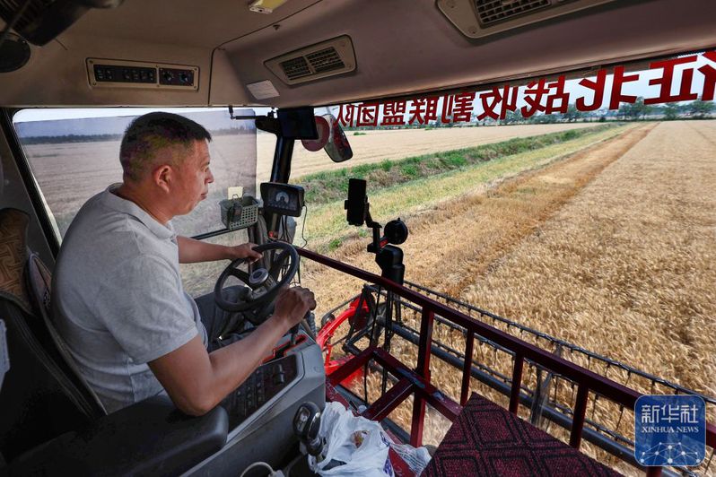 5月28日,江蘇農墾三河農場農機手操作收割機收割小麥。新華社發(許昌銀攝)
