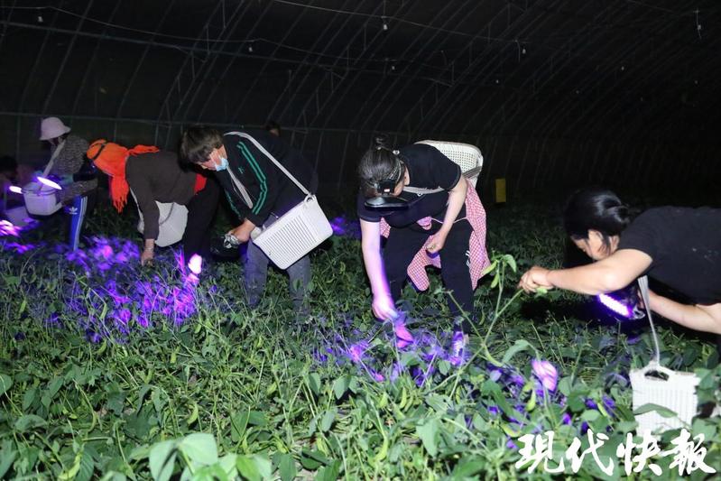 工人借助紫光燈在捕捉豆丹