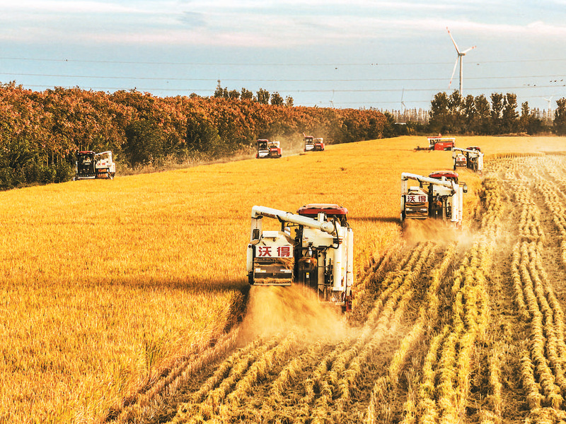 11月3日,江蘇省鹽城市射陽縣新洋農場組織收割機械搶收水稻。張偉生攝(人民視覺)