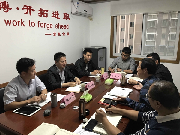 10月10日下午,集團公司黨委委員、副總經理仲小兵一行到蘇墾金屬調研指導工作,蘇墾金屬公司領導班子陪同。  仲小兵前往銷售網點、倉儲公司實地考察了解公司的具體業務情況,并聽取了蘇墾金屬前三季度經營