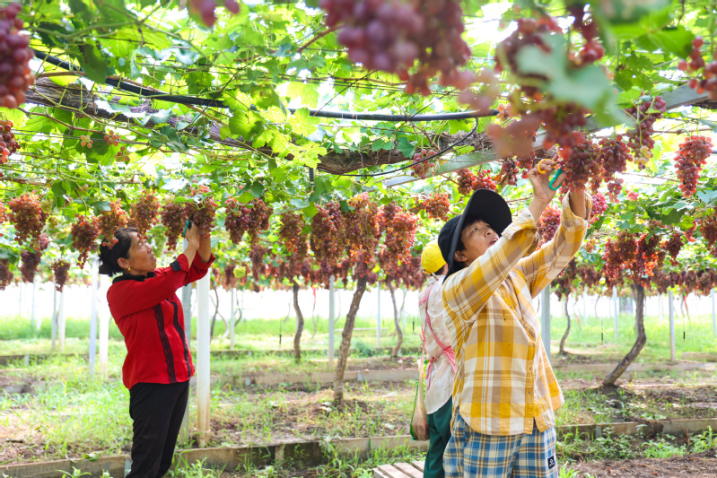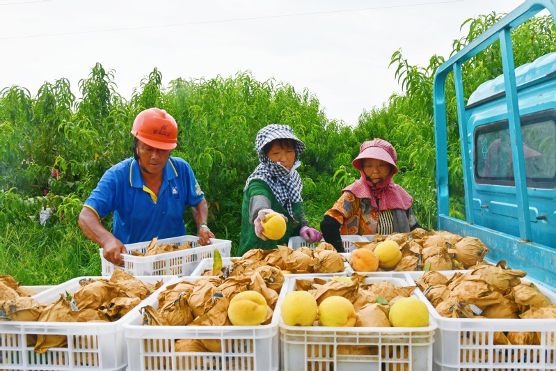 8月20日,淮海的錦繡黃桃迎來了豐收季,一個個色澤金黃、飽滿多汁的黃桃掛滿枝頭,果香四溢。為了拓寬銷售渠道,提升“墾一代”黃桃的知名度和銷量,淮海農(nóng)場公司新媒體工作室進行首次錦繡黃桃品類抖音直播銷售。“淮海農(nóng)場錦繡黃桃今天新鮮上市啦!”走進淮海農(nóng)場抖音直播間,主播們正熱情洋溢地介紹著面前擺放的錦繡黃桃。“親愛的朋友們,歡迎來到我們的直播間!我是主播阿姚,今天為大家?guī)淼氖莵碜曰春5腻\繡黃桃,這也是第一次在線上銷售黃桃。大家看,這些黃桃都是下午剛從生產(chǎn)基地果園采摘回來,我們希望第一時間與大家分享這份美味,我們淮海黃桃個頭碩大,色澤金黃,湊近聞一聞,滿滿的果香撲鼻而來,一口咬下去,滿滿的幸福感,直播間優(yōu)惠多多,快來搶購吧!”主播拿起一個黃桃,向鏡頭展示著。屏幕前,觀眾們紛紛涌入直播間,留言區(qū)滾動著“看起來好甜啊”“主播快介紹怎么購買”“看著就好想吃!”“上次買的翠冠梨不錯,這次復購黃桃肯定沒錯”等消息迅速在屏下滾動。主播阿姚一邊回應著觀眾的熱情,一邊拿起一個黃桃,輕輕削開果皮,露出里面金黃色的果肉,向廣大網(wǎng)友展示黃桃的鮮美。8月21日,在梨桃生產(chǎn)基地里,雖然下起毛毛雨,但志愿者們穿梭在果園
