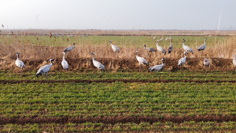 “快看,好多大鳥!”1月12日上午,在淮海農場七分場社區墾三隊的麥田里,分場技術員王凌云在用無人機巡田時,突然發現了成群的灰鶴及幾只稀有丹頂鶴在此棲息。為留下這些珍稀鳥類的影像資料,他連忙用無人機對準拍攝,記錄下這些鳥兒在這里駐足的珍貴鏡頭,這也是淮海農場首次看到如此多的珍稀鳥類群體聚集在此越冬。七分場是淮海農場最東端的一個分場,毗鄰國家丹頂鶴自然保護區,占地1萬多畝,與黃海一堤之隔,海岸線南北長達近5公里。堤外濁浪滾滾,堤內綠意濃濃,少人的管理,靜謐的環境,綠色的麥苗,搖動的風車和黃色的枯草,讓這里的生態風景如畫。近百只灰鶴和丹頂鶴組成的“團隊”落腳農場麥地,它們或追逐嬉戲,或駐立棲息,或低頭覓食,在無人機的視角下,盡顯生態之美、和諧之美、發展之美?!拔沂窃趬ㄈ狖溙锢锟匆娝鼈?,當時離它們差不多200米左右,但是距離太遠不能完全確定,后來請我們生產區珍禽巡護員梁永河與珍禽保護區專家聯系辨認,才確定是國家一級保護動物丹頂鶴和國家二級保護動物灰鶴?!蓖趿柙普f,當時農渠里飄起毛茸茸的蘆花,襯得麥苗綠油油,綠黃交界處,立著一群雪白身影,丹頂鶴和灰鶴悠然踱步其間,自成風景,讓我倆甚是贊嘆。多年